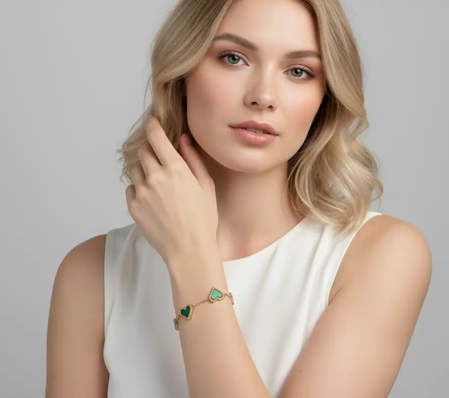 Pulsera Dorada con Corazón Verde Acero Titanio