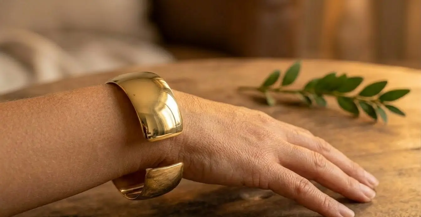 Estilo clásico pulsera ancha en acero inoxidable chapada en oro 18 quilates. Color dorado y plateado.